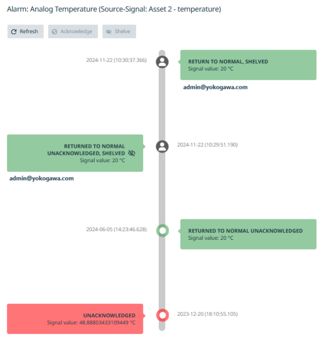 This entity records all the triggered alarm which already go back to return to normal state from different data source and user can view the history of each alarm, by selecting a specific alarm history, entity will show the full history of the selected alarm, e.g., when is the alarm triggered, date time of user acknowledged the alarm and datetime of alarm go back to return to normal state. Below figure show the history trail of selected individual alarm.